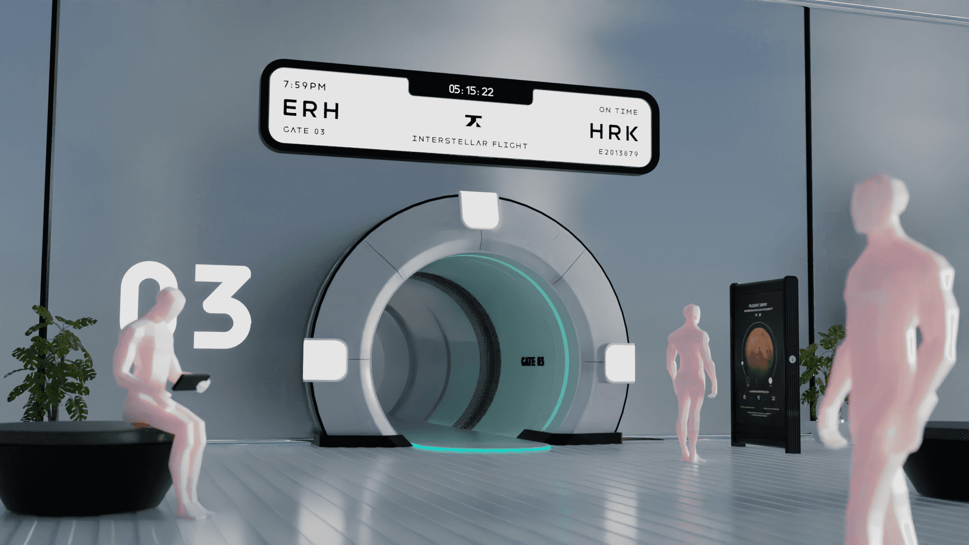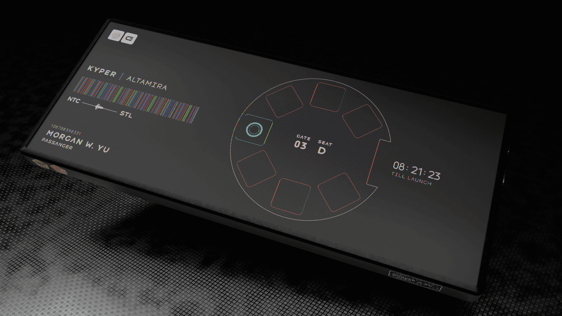 The Kyper Navigator originally did not exist in this project, but was later added after creating multiple iterations of a spaceflight app on a smartphone and not having a solution for the design of the spaceflight tickets. Many previous designs did not look futuristic enough for Kyper’s brand, so a new device was created and justified with the idea that a smartphone would not be subtable for interstellar space travel.