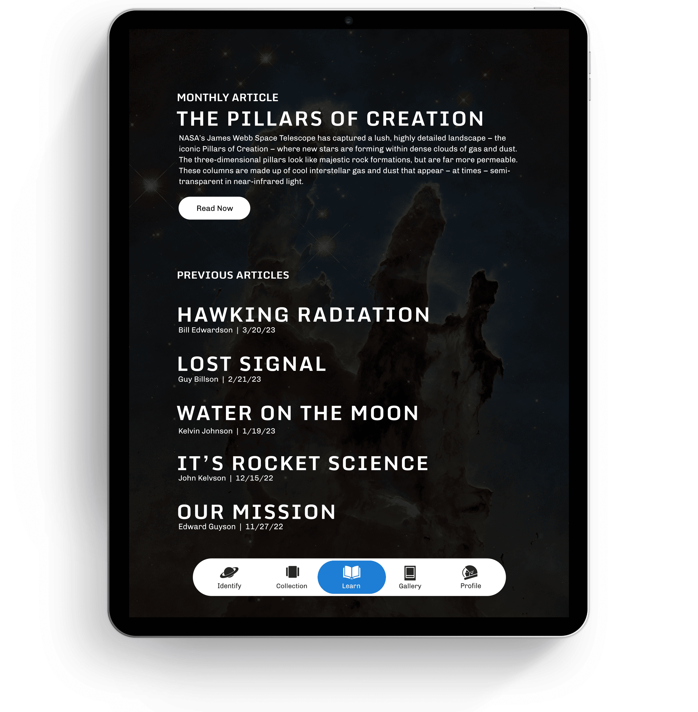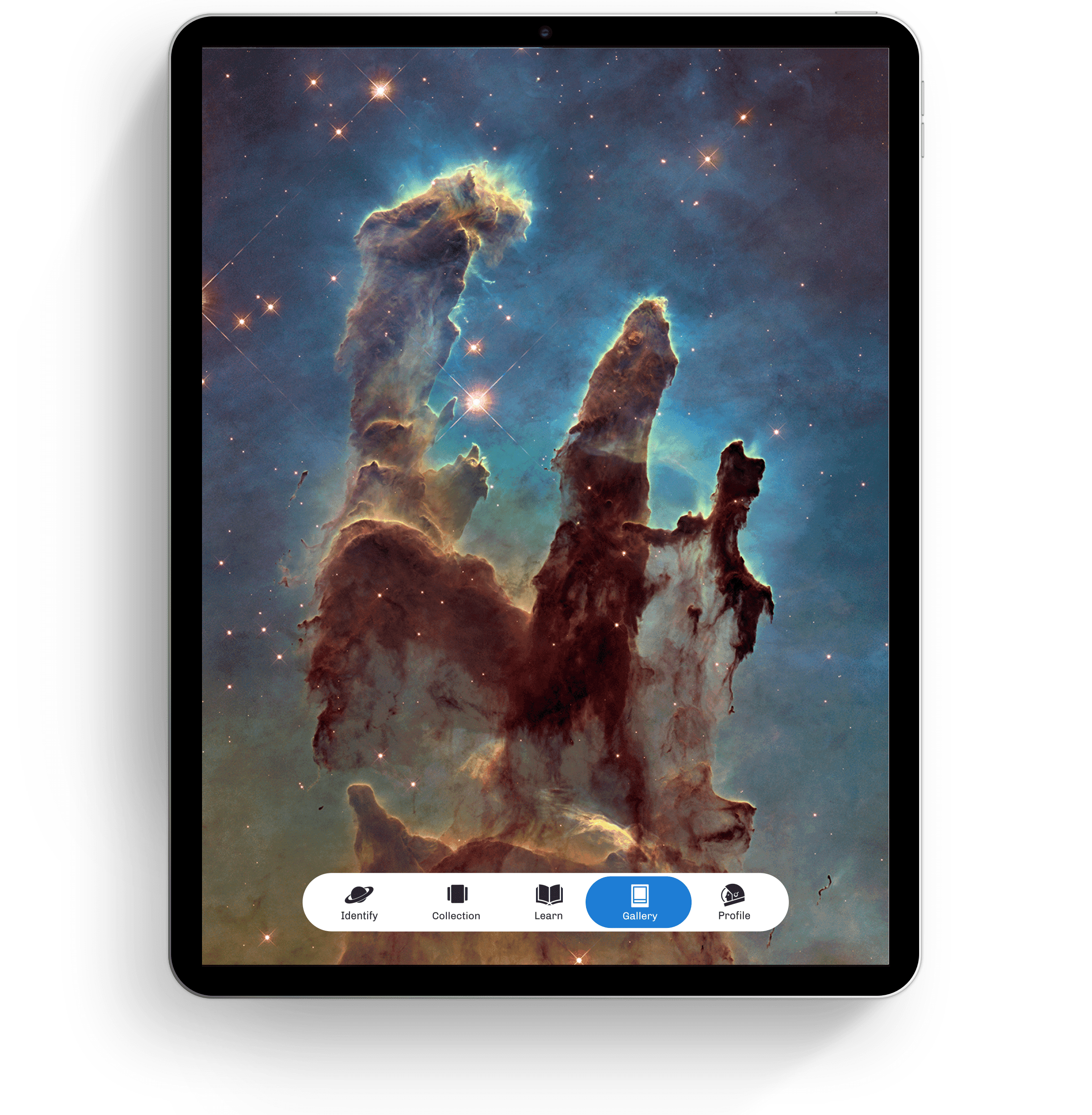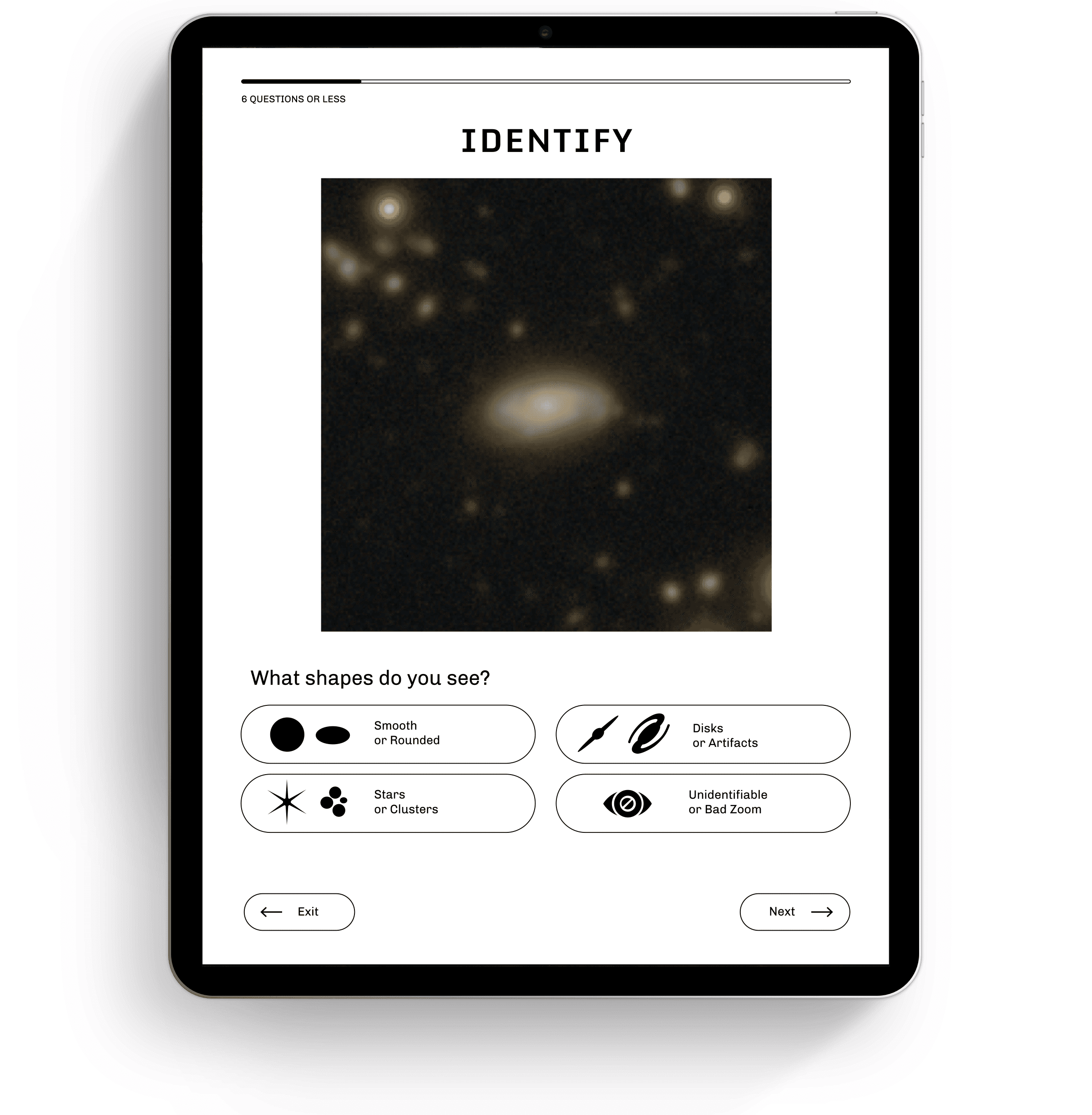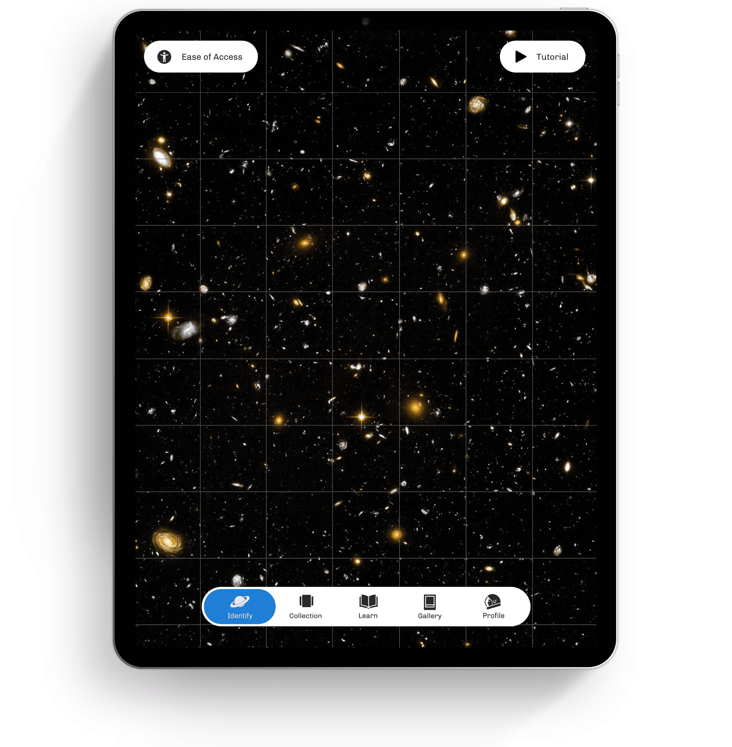 The primary function of the app allows the user to contribute to scientific research by helping astronomers classify galaxies. The user can select a photo from a large grid of photos.